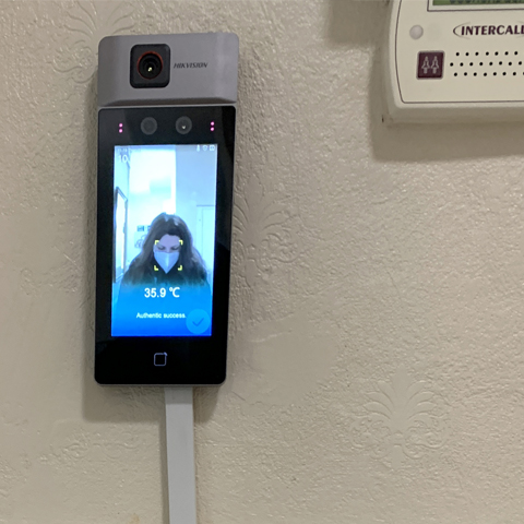 We have installed a facial recognition thermal imaging camera at the enterance. If the face recognized by the Thermal imaging camera does not wear a protective face mask or has a high temperature, the system will automatically detect this.